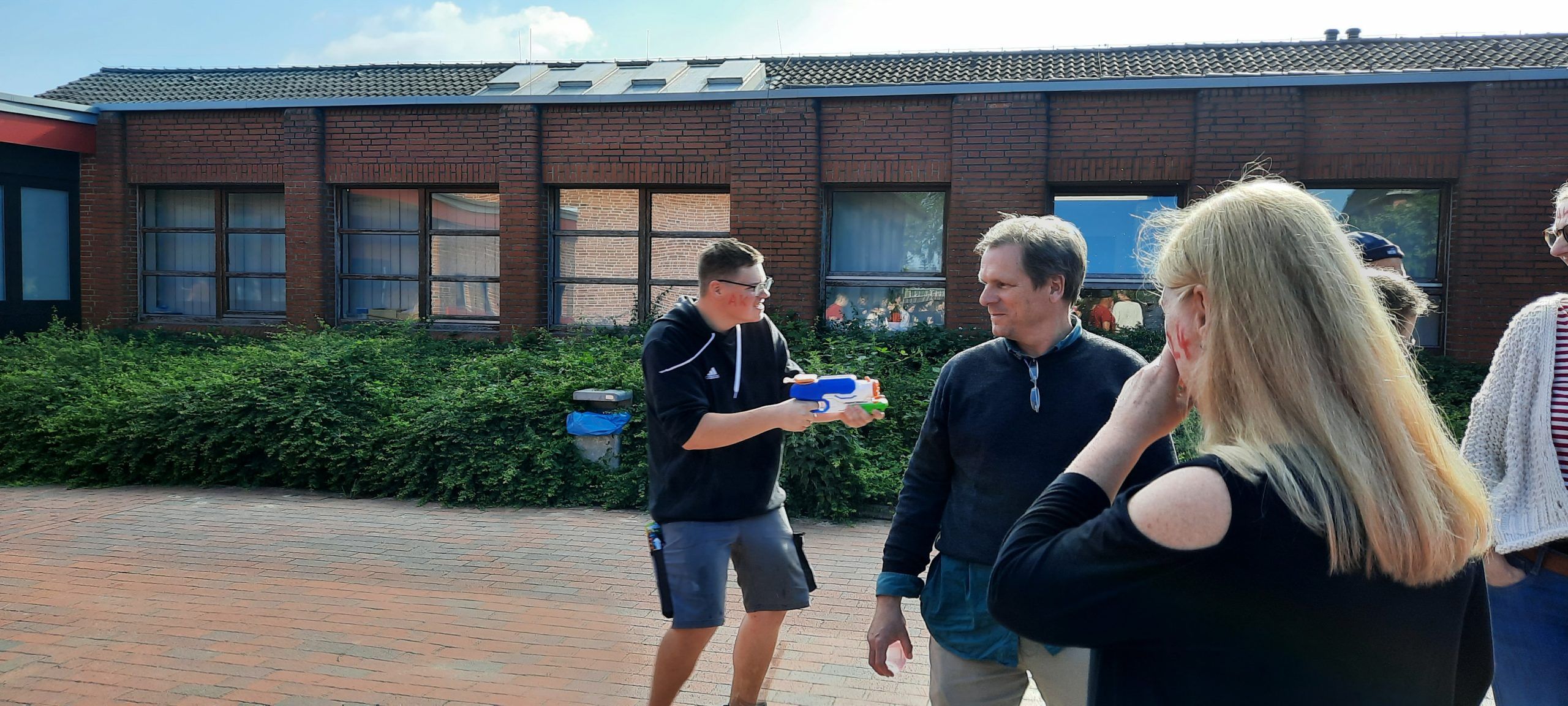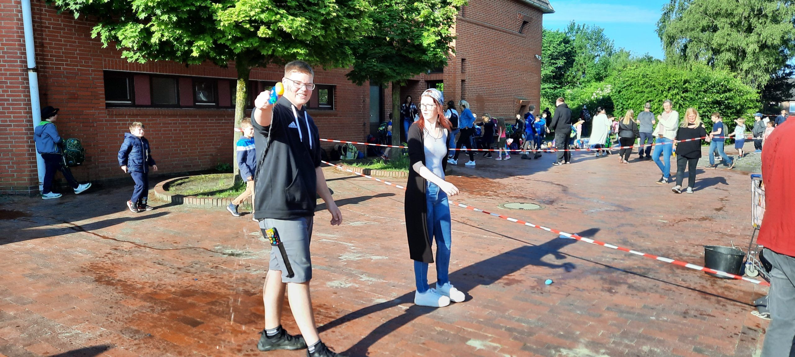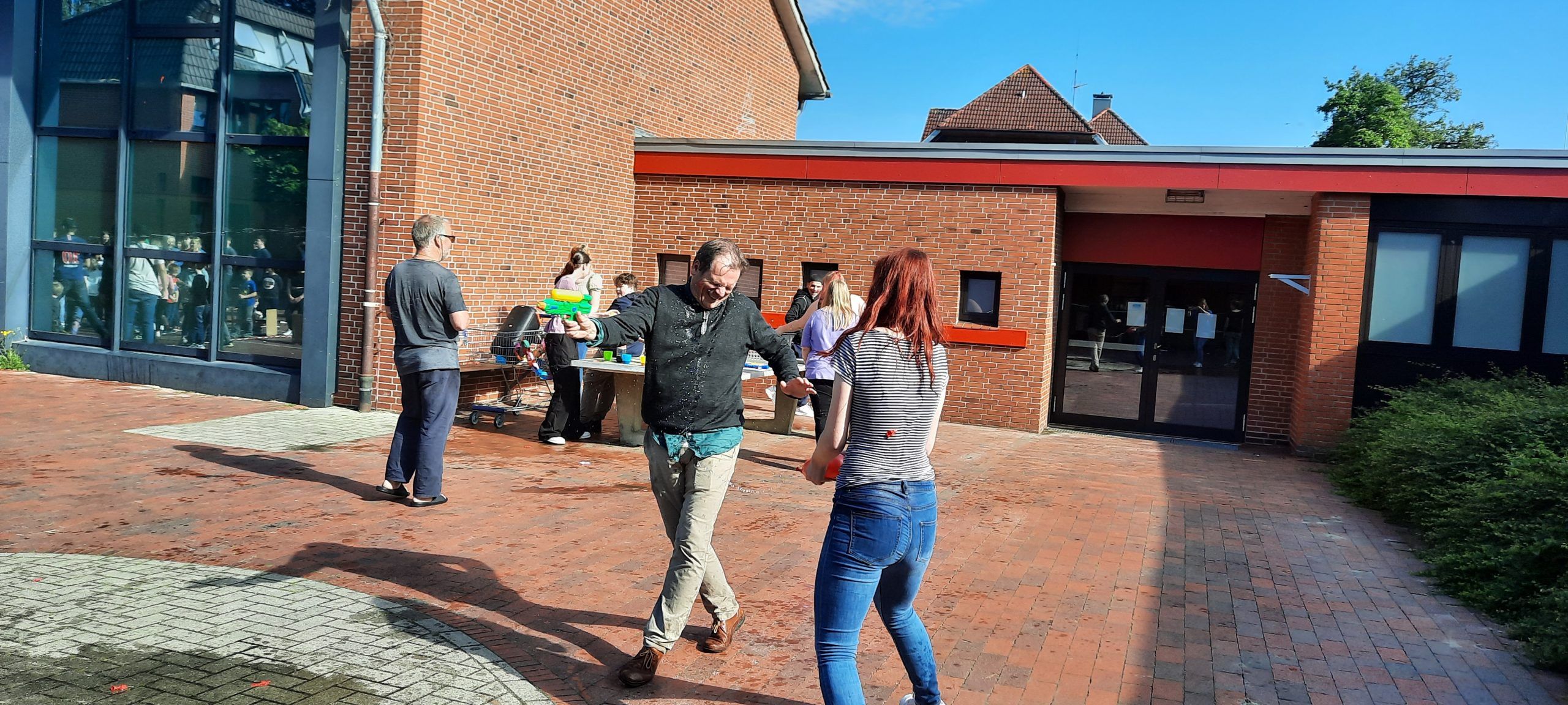Auf dem Schulhof entwickelte sich im Laufe der Zeit eine intensive Wasserschlacht zwischen Schülern und Lehrkräften. Zum Schluss fand ein gemeinsamer Stopptanz statt. Ein gelungener Abschlussstreich, der vielen Beteiligten Spaß gemacht hat! Ein dickes Lob an die 10. Klassen: