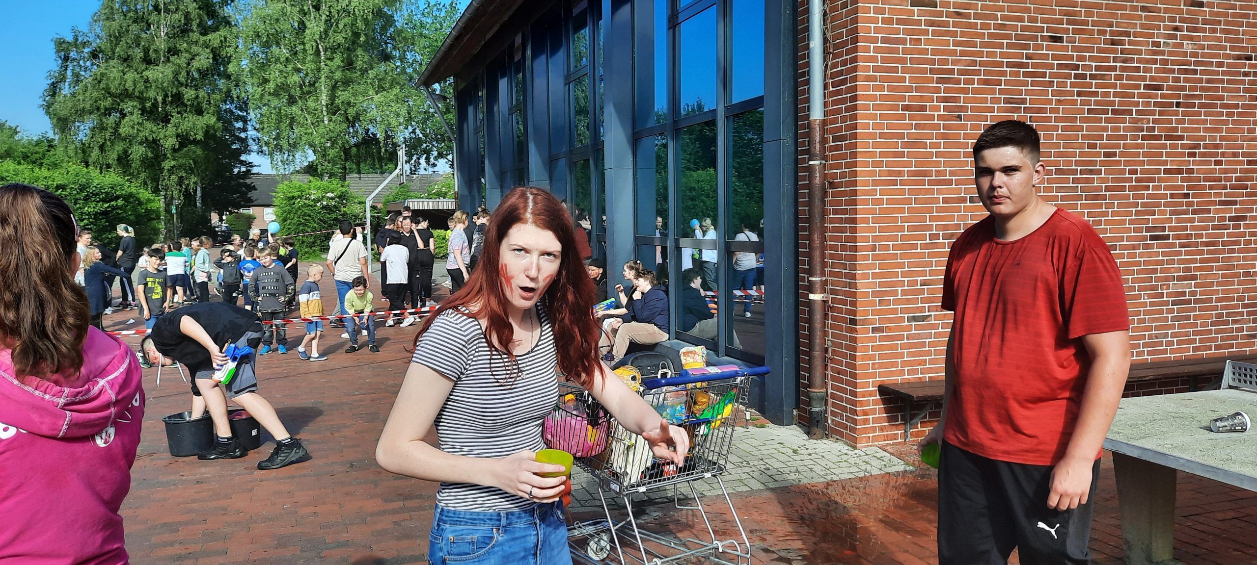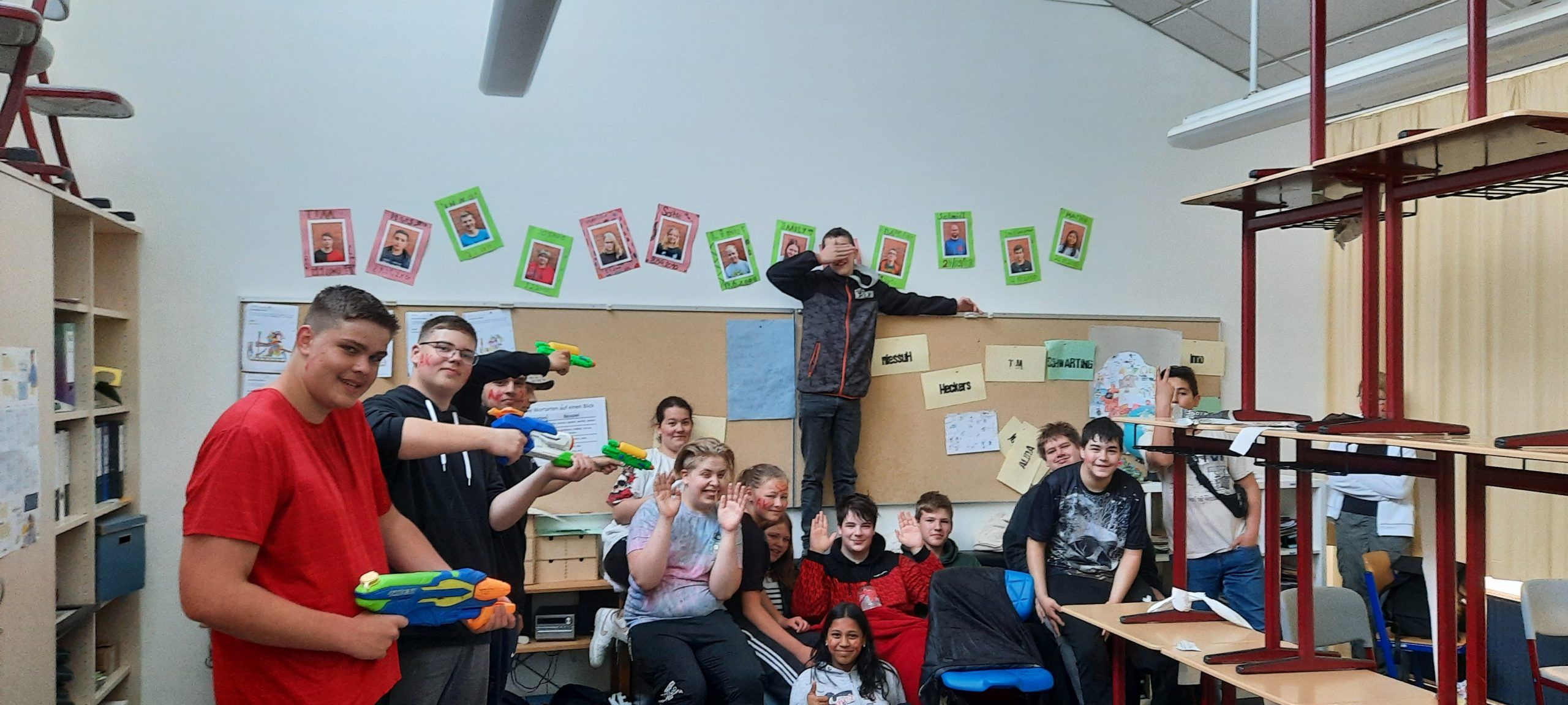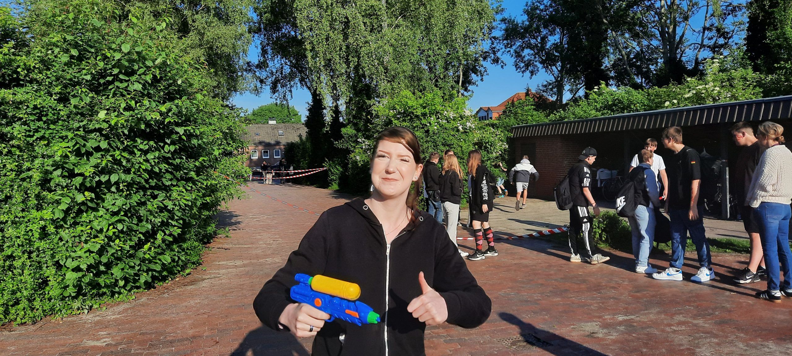 Auf dem Schulhof entwickelte sich im Laufe der Zeit eine intensive Wasserschlacht zwischen Schülern und Lehrkräften. Zum Schluss fand ein gemeinsamer Stopptanz statt. Ein gelungener Abschlussstreich, der vielen Beteiligten Spaß gemacht hat! Ein dickes Lob an die 10. Klassen: