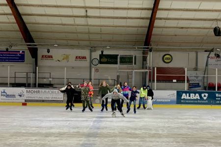 Zuerst haben wir uns an einem Stand Schlittschuhe ausgeliehen. Dann konnten wir Schlittschuh fahren, spielen und uns Snacks und Getränke in dem Bistro kaufen. Das Beste war, dass wir ‚Eisbären‘ zum Üben bekommen haben. Das hat richtig Spaß gemacht. Die Musik war cool.